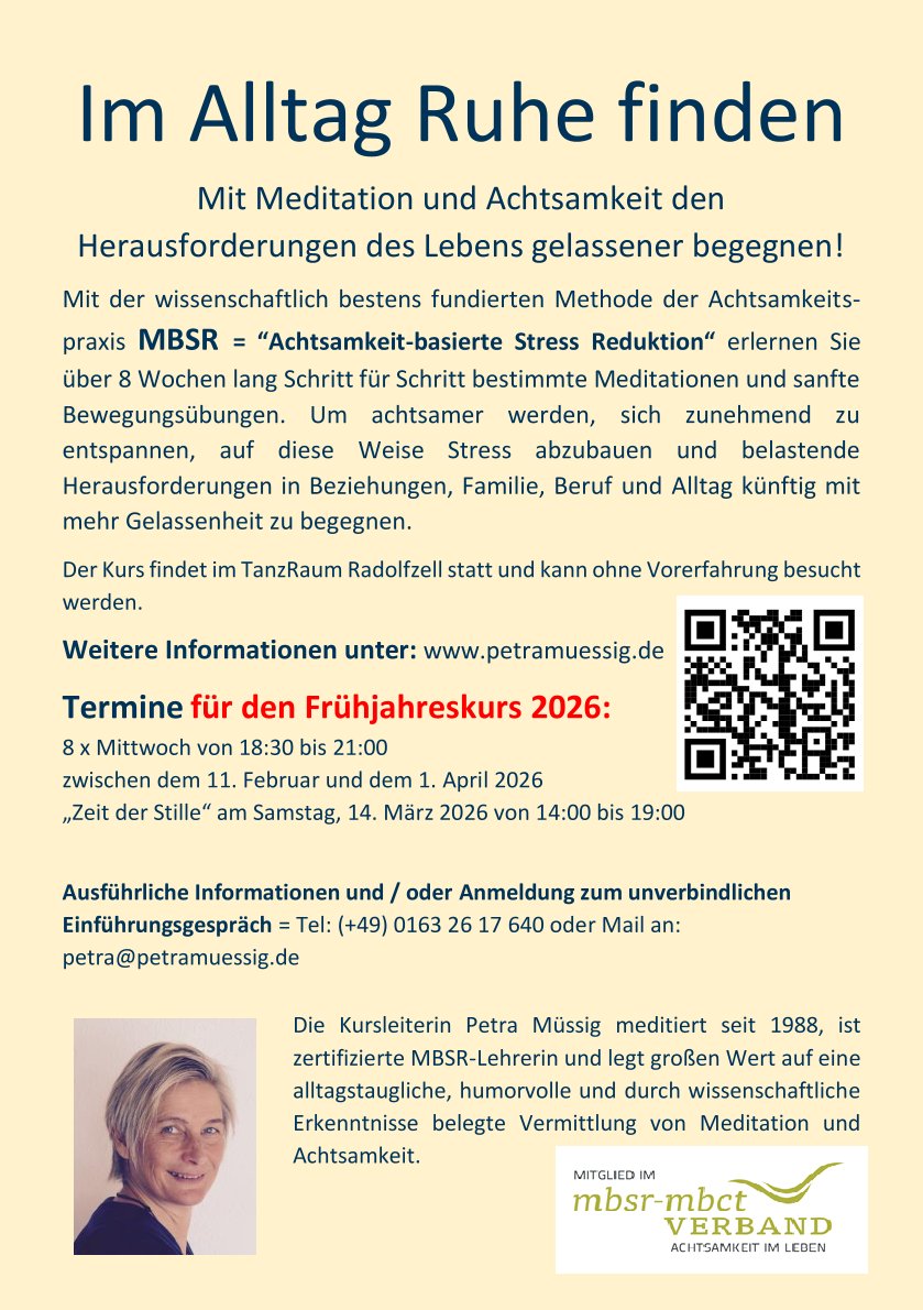 Um achtsamer zu werden, sich zunehmend zu entspannen, auf diese Weise Stress abzubauen und belastende Herausforderungen in Beziehungen, Familie, Beruf und Alltag künftig mit mehr Gelassenheit zu begegnen.